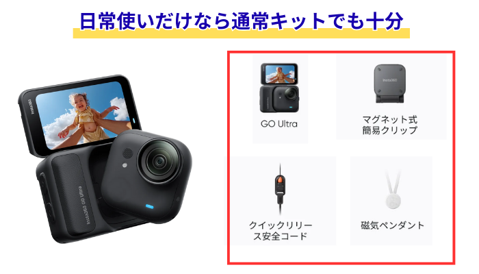 Insta360 Go Ultraは本体だけでも撮影できますが、ファミリーキットを選ぶと最初から便利アイテムがしっかり付いてきます。