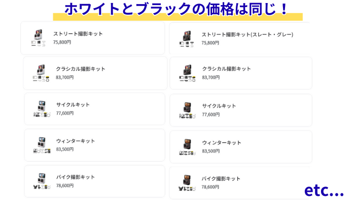 ただし、ホワイトには通常版がなく付属品がお得なセットになったキットモデルしかないのでそちらから選ぶようにしましょう。