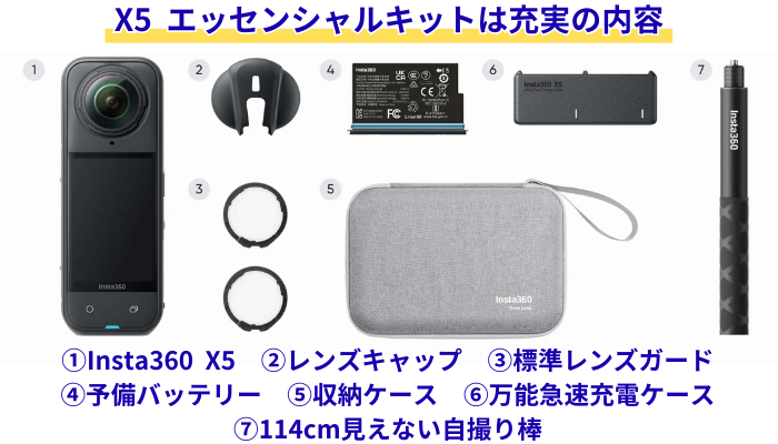 Insta360 X5のエッセンシャルキットは、本体に加えてすぐに撮影を楽しめる必須アイテムがそろったセットです。