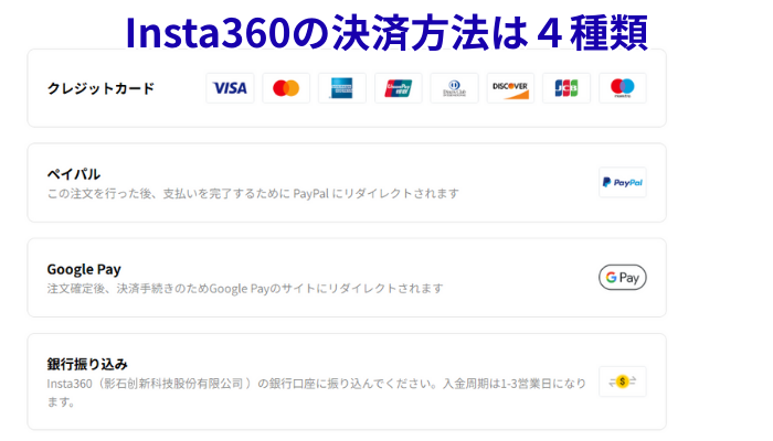 「Insta360って、どんな決済方法が使えるんだろう?」