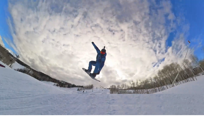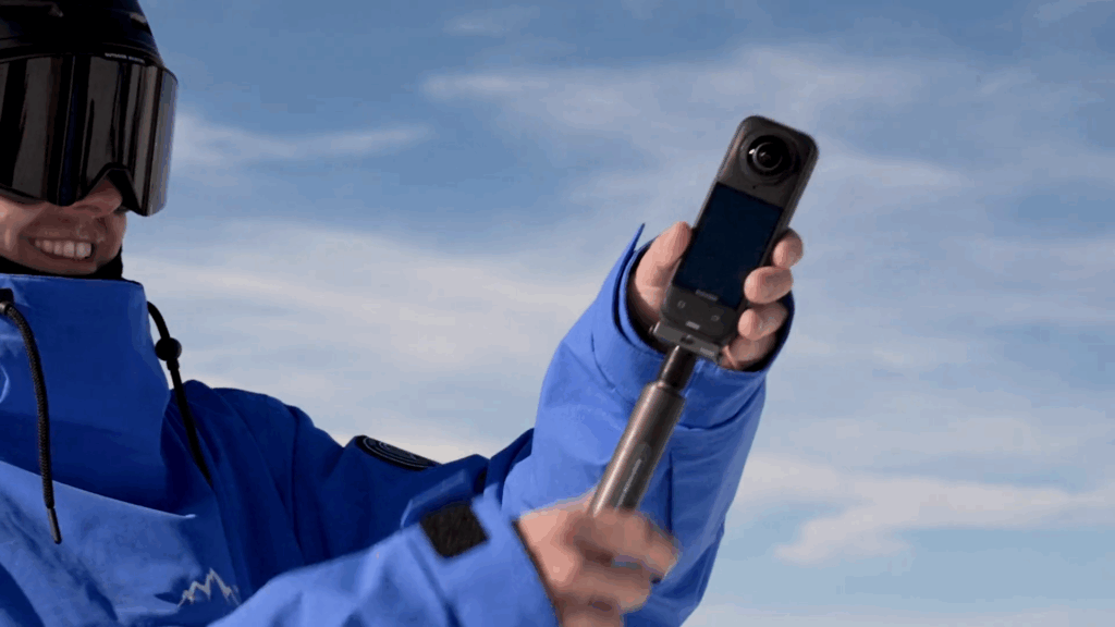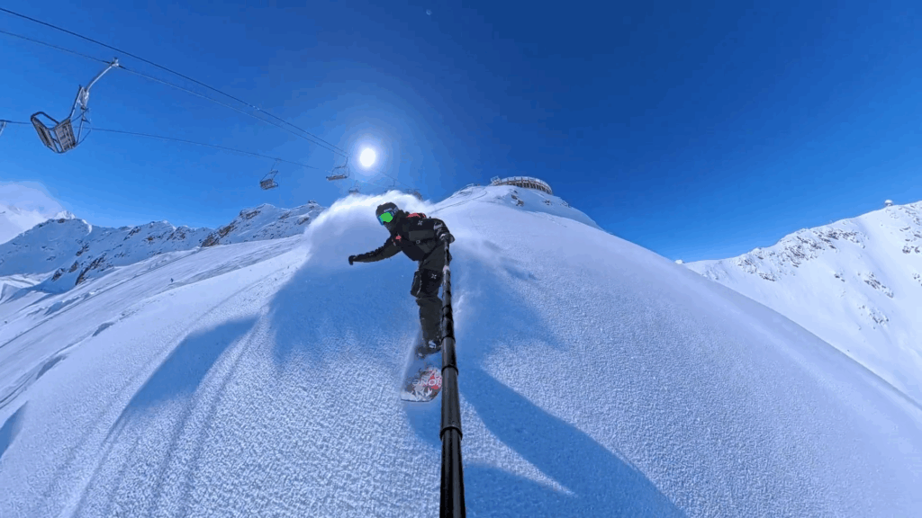 見えないアクション自撮り棒を使えば、自分の姿とゲレンデ全体がまるでドローンで追いかけているように映ります。