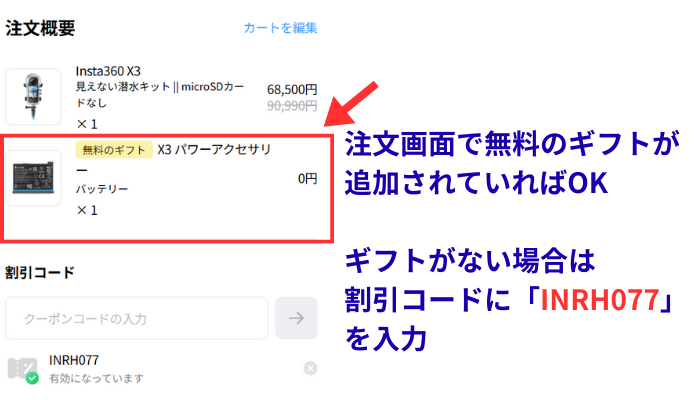 もし無料のギフトが入っていなかったら、割引コードに「INRH077」と入力してくださいね。(無料のギフトが画面に出ていれば割引コードの入力は不要です)